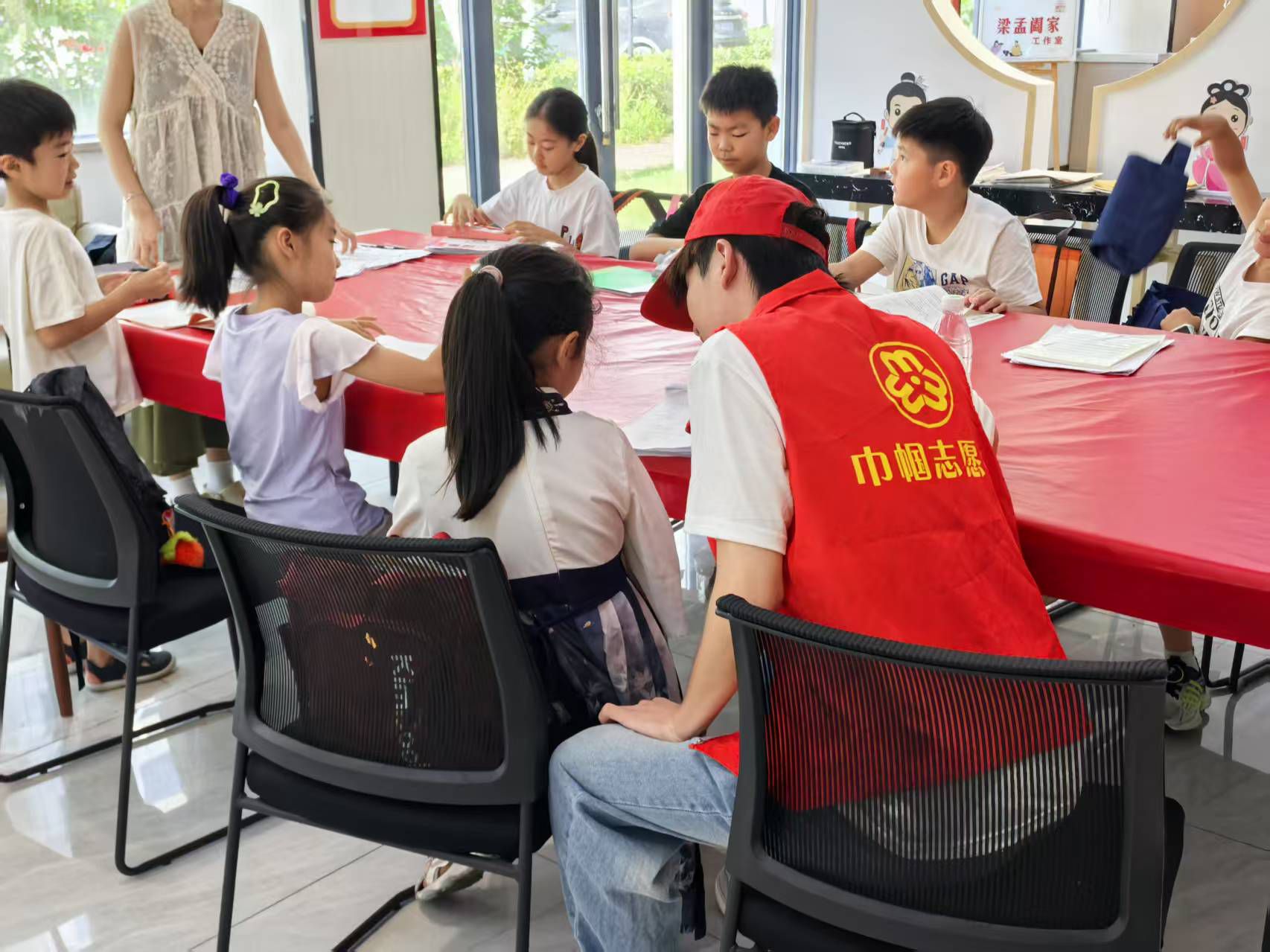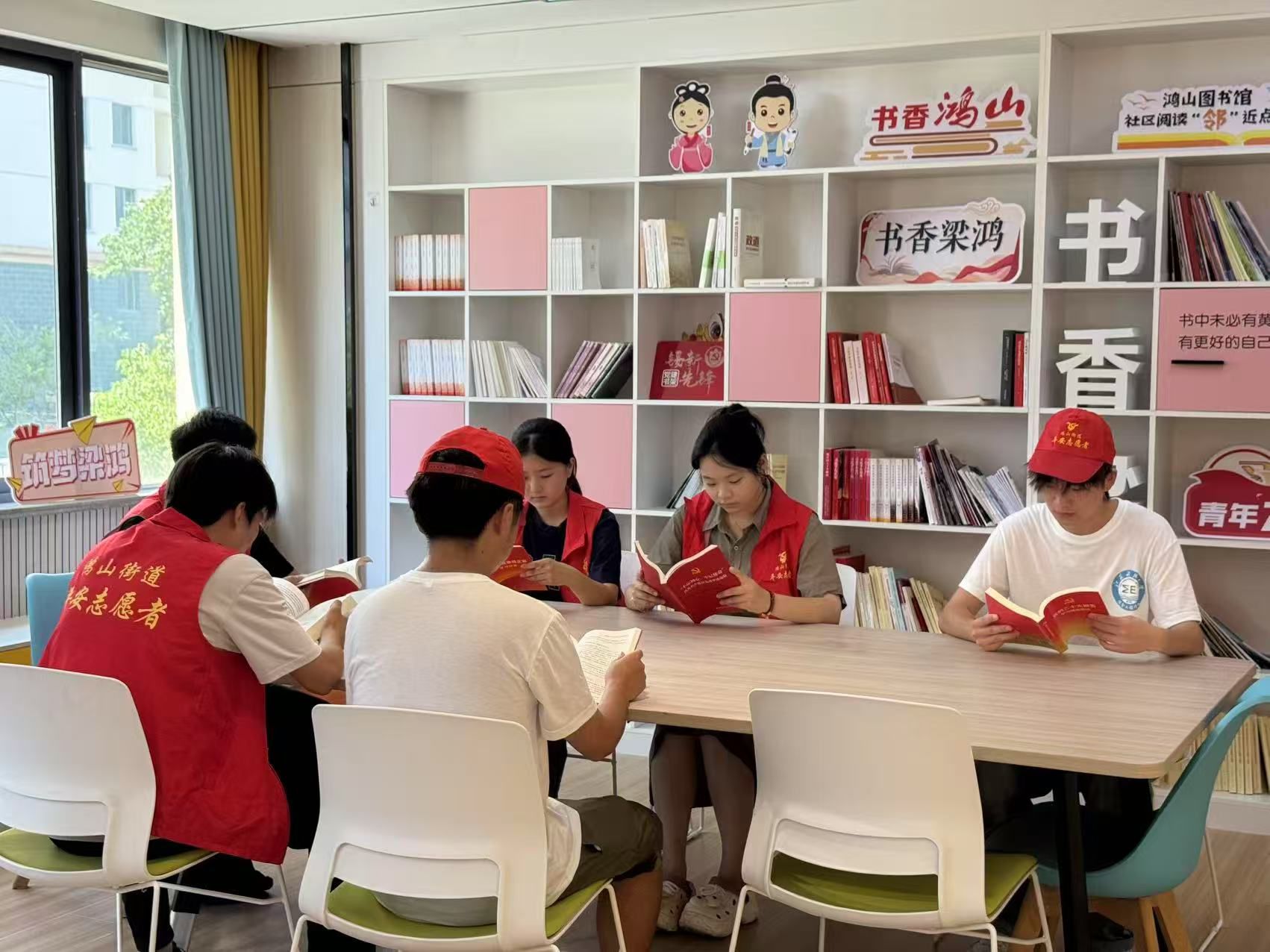 上午9點在"梁鴻社區黨群服務中心"內,陽光透過落地窗斜照在木質長桌上,六位身著"鴻山街道志愿者"紅馬甲的身影格外醒目。他們有的托腮輕讀《青春之歌》,有的用鉛筆在《紅色家書》旁標注感悟,書架上"書香梁鴻""改錯·成長"的標語牌與卡通裝飾相映成趣,連窗外的綠植都仿佛屏住了呼吸,生怕打擾這份專注。