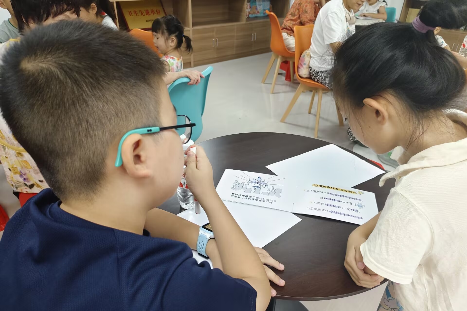 面向青少年群體,團隊則組織了互動式宣講活動,并發放自制的趣味宣傳手冊。宣講活動伊始,志愿者以“小朋友們都知道哪些人工智能?”為話題展開討論。孩子們爭相舉手:“DeepSeek!”“小愛同學!”“掃地機器人!”他們不僅列舉了常見的AI應用,還提出了“機器人是怎樣思考的?”“AI是怎么改變人們模樣的?”等富有洞察力的問題。依此,志愿者用通俗易懂的語言向孩子們介紹了人工智能的概念及基本原理,并結合生活場景展示了智能語音助手、人臉識別系統等應用案例
