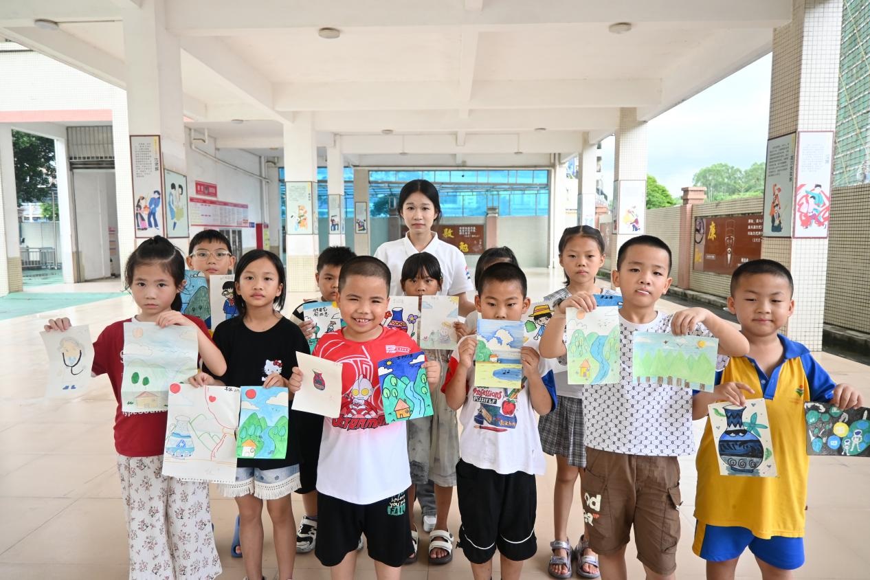 為深入貫徹國家《“十四五”鄉村教育振興行動計劃》中“推動優質教育資源下沉鄉村”的部署,響應共青團中央“三下鄉”社會實踐號召,2025年7月16日至7月23日,廣州新華學院中文系分身劇社突擊隊深入廣東省鶴山市桃源鎮桃源小學,開展了為期八天的“藝術侵潤童心”美育支教活動。盡管面臨臺風和暴雨的雙重考驗,團隊仍以靈活調整和加倍熱情,通過系統化的書法、手工、話劇、繪畫、朗誦藝術課程設計,為孩子們帶來了一場難忘的,充滿韌性、創意與溫情的美育之旅。