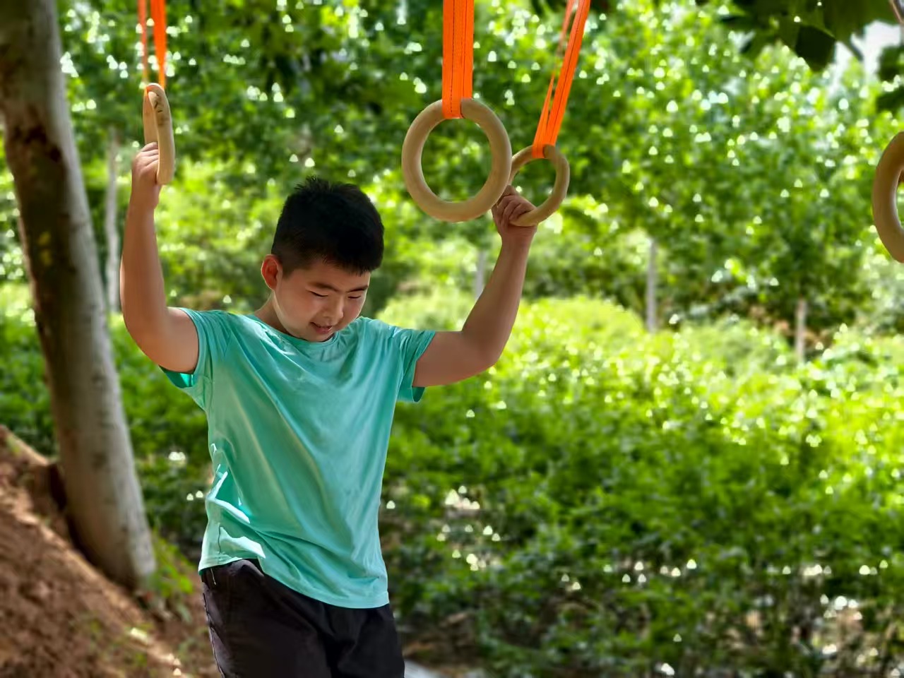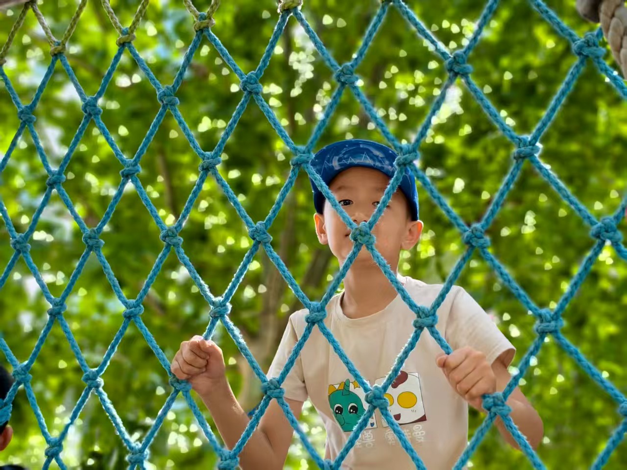 上午,同學們分為兩隊,在黑叔的指導下展開了“撒野大闖關”六關挑戰(zhàn)。匍匐越障時,大家在沙地上奮勇爭先,膝蓋抵著沙粒,身體緊貼地面,卻把困難變成了歡樂的游戲;攀樹鳴金環(huán)節(jié),每向上一步都離不開手腳并用,老師的托舉與同伴的鼓勵化作自信的搖鈴聲,滿載著驕傲;輪胎接力中,沉重的輪胎和漫長的賽道沒能阻擋前進的腳步,隊友的期盼眼神與吶喊讓頑強的腳步愈發(fā)輕快;懸輪競速考驗著力量與耐心,孩子們?nèi)褙炞⒌募兇獗人俣雀@珍貴;鉆桶競速像一場童年探險,在黑暗中堅持前行,終會遇見光明;箭術爭勝時,孩子們化身小小弓箭手,“9環(huán)!10環(huán)!”的吶喊聲中,藏著被擊中的童年夢想。
