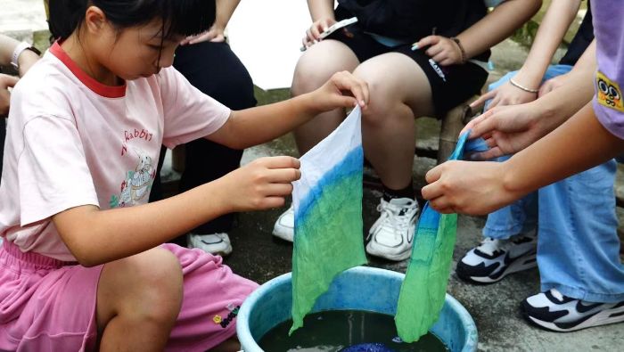 過程中,隊員們融入現代審美,以幾何創意設計染布紋樣;返鄉孩童亦參與其中,與隊員共洗染桶、晾曬方巾,讓非遺技藝在代際協作中自然延續。曾春雷老師感慨:“青年人的參與,讓墩頭藍從歷史樣本變成了扎根鄉土的文化生命體。”