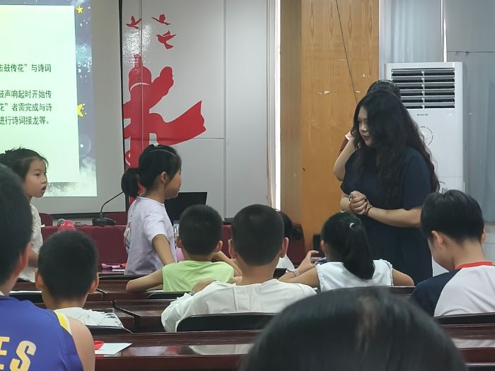 在“詩詞擊鼓傳花”環(huán)節(jié),孩子們或緊張或興奮地吟誦與月亮、星辰相關的詩句。稚嫩的童聲念出“小時不識月,呼作白玉盤”。當鼓聲停歇,被選中的孩子分享對詩句的理解,過程中神情專注。