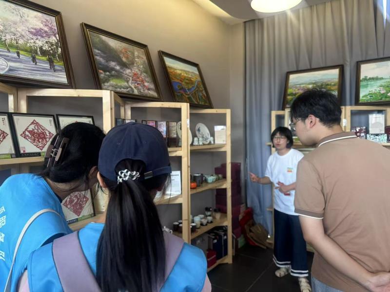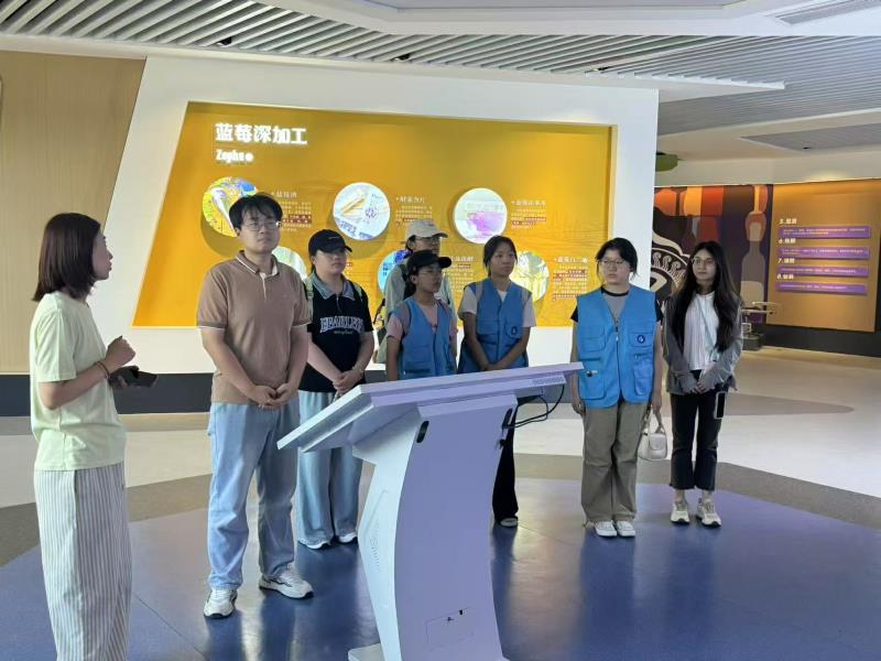 此外,團隊成員還共同去到了紫斐藍莓展廳,調研了智慧農業與電商直播帶動下的“紫色經濟”。展廳內,藍莓果酒、果醬和果汁等深加工產品琳瑯滿目,延伸了藍莓的產業鏈,增加了附加值,根據講解員的講解,了解“小藍莓”帶來的“大發展”。紫斐藍莓與當地村民合作,用他們種植的藍莓去生產果酒、果汁、果醬等等,為鄉親們創收,講解員說到:“在行情不好的時候,這種直接收購鄉親們藍莓的方式也可以為他們兜底。”
