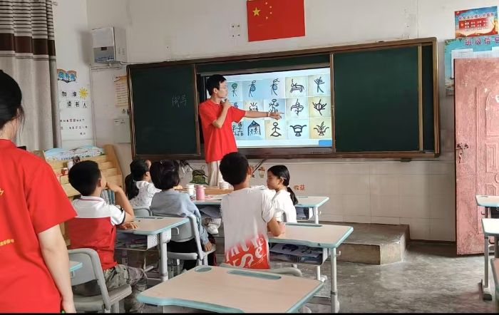 在以納西族古老文字東巴文為背景設(shè)置的東巴文猜猜樂(lè)環(huán)節(jié)。孩子們熱情高漲、爭(zhēng)相搶答,實(shí)踐隊(duì)隊(duì)員借圖畫拆解文字寓意,助力孩子在歡笑中識(shí)“山”“水”等字符,感受東巴文獨(dú)特魅力,悄然播撒民族文化傳承種子。