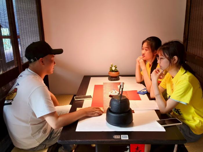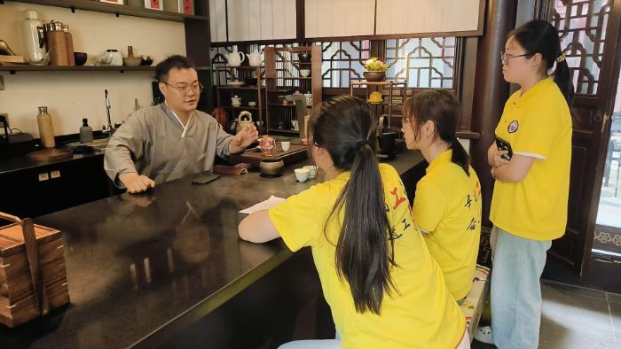 以藝術(shù)傳承者的視角了解了評彈的堅守與困惑后,7月25日中午,團隊將目光投向評彈當代的“生存載體”,與狀元府第店長展開了關(guān)于文化與商業(yè)共生的探討。交流中,店長既展現(xiàn)出對評彈文化的深刻認知,也流露著對業(yè)態(tài)運營的務實思考。交談主題圍繞“如何讓評彈在當代活態(tài)傳承”這一核心展開。