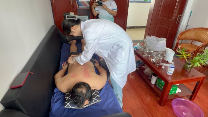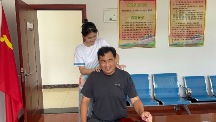 在調節神經功能的同時,團隊同步實施推拿與拔罐相結合的復合療法,將治療重點精準作用于職業勞損的核心區域。學生們手法嫻熟,通過揉法、按法、㨰法對交警們長期僵緊酸痛的斜方肌群以及承受巨大壓力的腰骶區域進行深度放松和疏通。隨后,配合拔罐療法(閃罐、走罐與留罐),在這些重點部位施以負壓吸引。這種復合療法能有效松解粘連的肌肉筋膜,強力促進局部血液循環,加速代謝廢物的清除,并顯著改善因勞損導致的局部氣血瘀滯狀態,為肌肉組織的修復和功能恢復創造有利條件。
