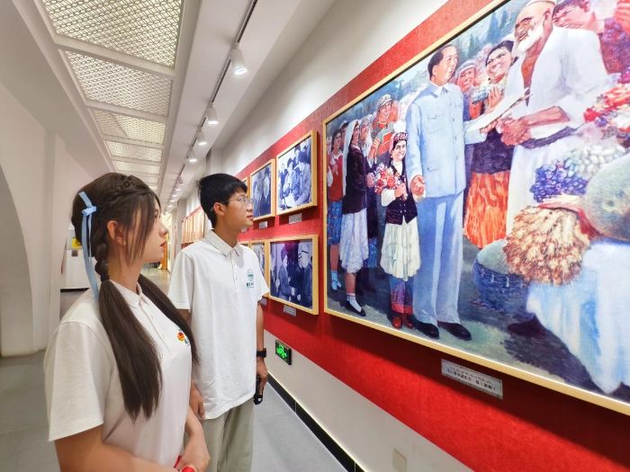 館內(nèi),960枚像章組成的中國地圖、5600枚像章黏貼的五角星,分別象征著祖國疆土與56個民族。團隊成員在像章前仔細端詳,在歷史圖片中回顧崢嶸歲月。大家久久不愿離去。