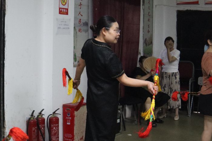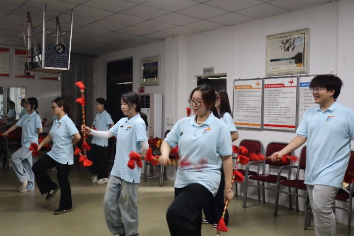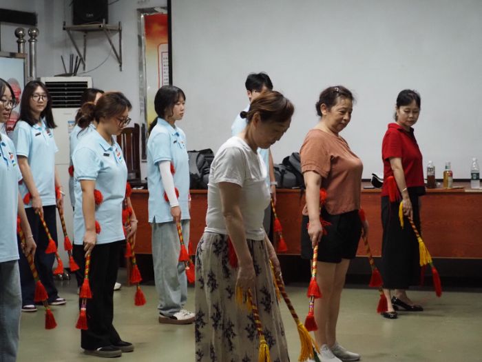在雙江鎮社區活動中心,實踐團成員認真學習蓮蕭技藝,目光專注。老藝人手持彩綢飄飄、銅錢叮當的蓮蕭,邊擊打肩、臂、腳、膝等身體部位,邊配合著獨特的步伐與唱腔,動作剛勁灑脫,節奏明快流暢,古老技藝的魅力瞬間點燃了現場。