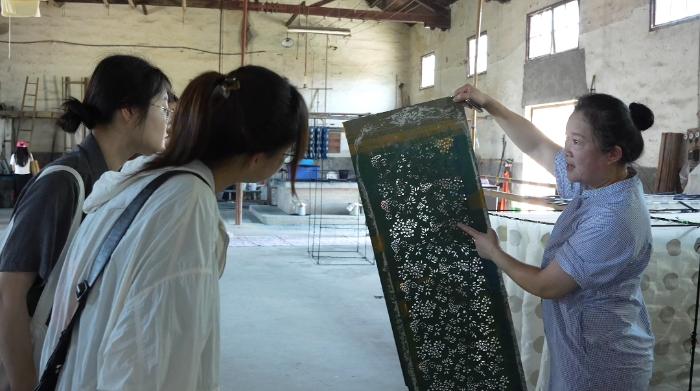 始建于1848年的曹裕興染坊,是南通藍印花布技藝傳承的重要基地。在這里,實踐團隊見證了藍白變化的驚喜瞬間。第五代傳承人曹曉峰老師向團隊成員講解了詳細的制作工藝,并著重介紹了花版設計的傳承與創新:“我們的花版圖案在繼承傳統經典紋樣的基礎上,巧妙融入了現代藝術元素,形成了獨具特色的圖案風格,從而讓藍印花布適應新時代的審美趨勢。”這種在堅守核心技藝基礎上的創新,正是非遺煥發生機的關鍵。
