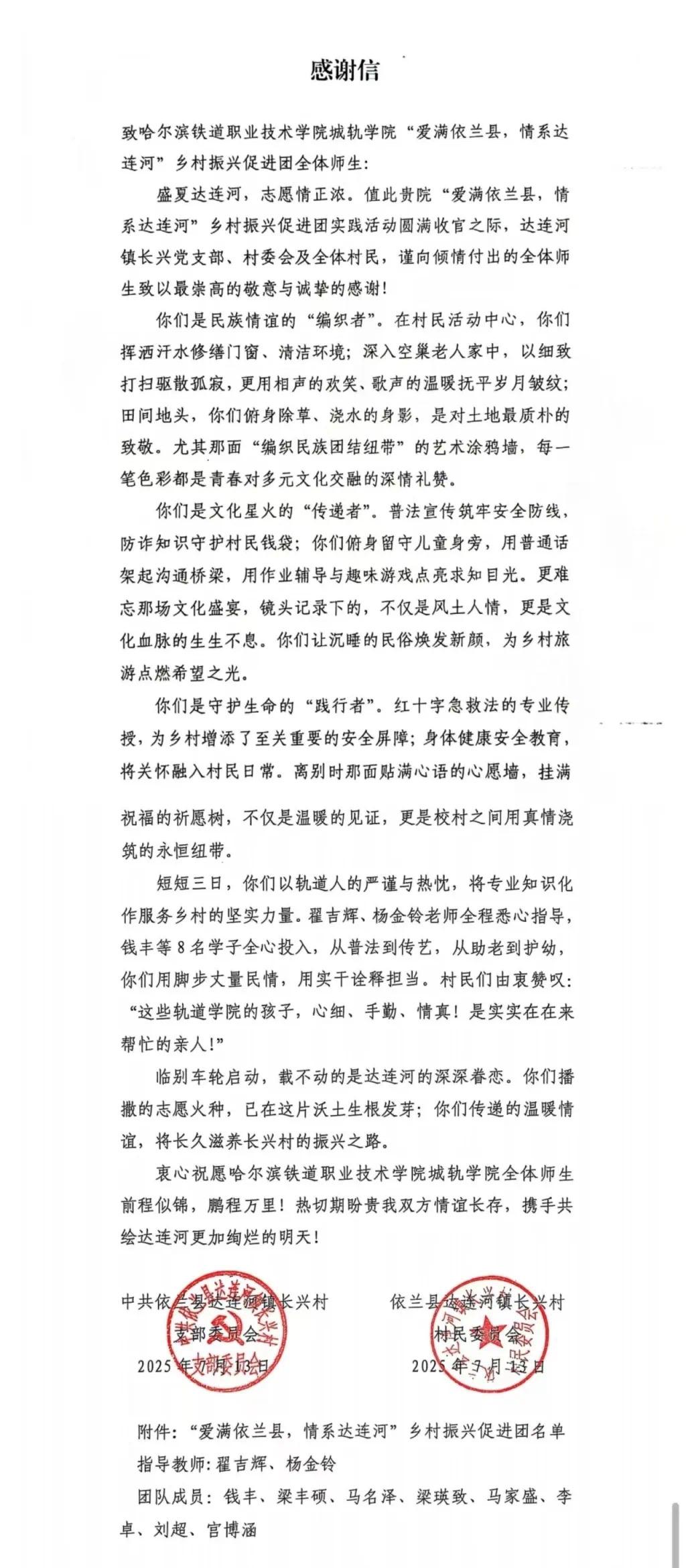 城軌學院為響應國家鄉村振興戰略號召,落實共青團哈爾濱市委2025年暑期“三下鄉”社會實踐活動部署,哈爾濱鐵道職業技術學院城軌學院“愛滿依蘭縣·情系達連河”鄉村振興促進團積極行動,在團總支組織引領下,于2025年7月10奔赴依蘭縣達連河鎮長興村,開展暑期實踐活動。達連河鎮政府全力支持,依蘭縣政府馬茌鎮長、姚前偉副鎮長,團依蘭縣委宋書記,以及長興村張寶柱書記給予有力保障,親臨現場看望城軌學院大學生志愿者。達連河鎮長興村擁有國家級合作社,在鄉村發展中發揮著重要作用。此次活動期間,同學們也深入合作社開展實踐,像參與合作社場地涂鴉等活動,以青春創意為鄉村添彩。同學們懷揣熱忱,以青春之名奔赴鄉土,將創意、汗水與知識注入鄉村發展,讓青春在助力鄉村振興的實踐中扎根成長,開啟這場盛夏鄉野的青春之約。