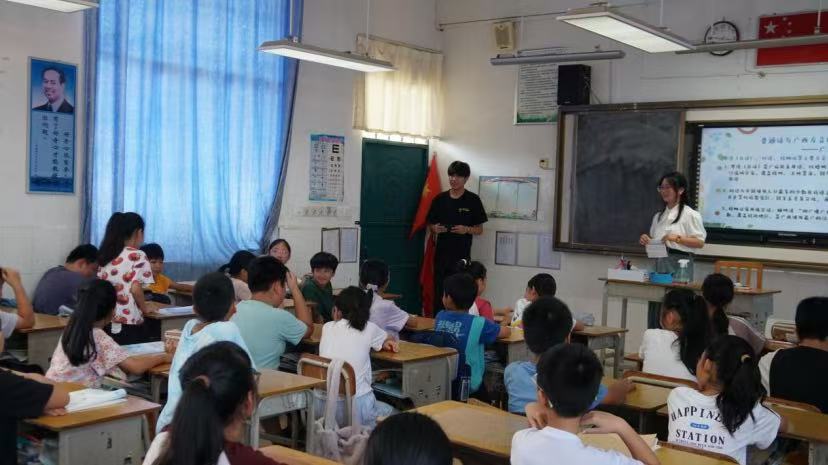 南寧理工學(xué)院“錦遇新世代”非遺創(chuàng)新實(shí)踐隊(duì)于7月3日深入南寧市武鳴區(qū),開(kāi)展了以“推廣普通話(huà),傳承非遺文化”為主題的實(shí)踐活動(dòng)。實(shí)踐隊(duì)先后走進(jìn)當(dāng)?shù)刂行男W(xué)開(kāi)設(shè)推普課堂,探訪納福彩繡工坊探究壯錦技藝,并專(zhuān)訪非遺傳承人,在語(yǔ)言推廣與文化傳承的交融中,書(shū)寫(xiě)了一段生動(dòng)的實(shí)踐篇章。