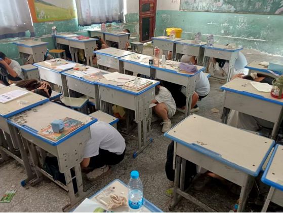 除了防溺水安全教育,支教團(tuán)還組織了地震演練活動(dòng),旨在提高孩子們在地震發(fā)生時(shí)的應(yīng)急逃生能力。演練開始前,志愿者們向孩子們詳細(xì)講解了地震發(fā)生時(shí)的應(yīng)對方法,包括如何尋找安全的躲避位置、怎樣有序撤離等知識。隨著一陣急促的警報(bào)聲響起,地震演練正式開始。孩子們迅速按照志愿者們的指導(dǎo),雙手抱頭,躲在課桌底下進(jìn)行緊急避險(xiǎn)。待警報(bào)聲短暫停歇后,孩子們在志愿者們的帶領(lǐng)下,用手護(hù)住頭部,躲在了課桌底下。整個(gè)演練過程緊張有序,孩子們在實(shí)踐中學(xué)會(huì)了如何在危險(xiǎn)來臨時(shí)冷靜應(yīng)對,提高了自我保護(hù)能力。