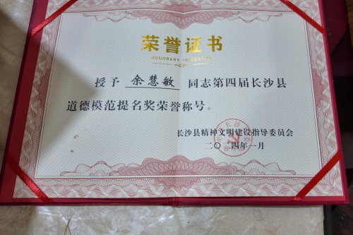 圖1為余慧敏所獲“道德模范”榮譽證書