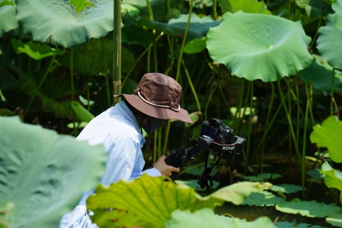 天光熹微,呂田鎮(zhèn)的千畝荷塘也迎來一群年輕的記錄者。無人機嗡嗡升空,俯瞰之下,無邊的碧綠荷葉鋪滿水面,與遠處青翠的山巒相接,構成一幅“接天蓮葉無窮碧”的壯闊畫卷。與此同時,地面的單反相機捕捉著細微處的生機:晶瑩的露珠在初綻的粉荷尖上顫動,蜻蜓輕盈點水于粉白花瓣之上。“這里的生態(tài)之美令人震撼。我們希望通過航拍的大場景和特寫的細節(jié),全方位展現(xiàn)呂田獨特的生態(tài)價值。”實踐團負責攝影的楊穎詩同學一邊調整著無人機遙控器一邊說道。團隊成員還親身體驗了蓮蓬采摘,感受特色農業(yè)與生態(tài)保護和諧共生的活力。