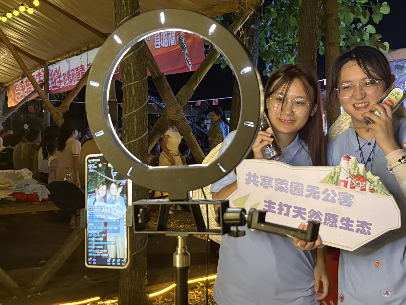 傍晚,鄉村振興促進團助力王家坪村村光大道演出活動。演出開始前,團隊成員積極協助舞臺布置人員完善舞臺設計并為后續直播做充足準備。演出進行時,團隊成員聚集在直播架后,介紹王家坪村的村光大道以及手磨咖啡、自產礦泉水、旅游套餐等商品,圓滿完成直播間人氣“十萬+”的任務。團隊成員團結一致,積極助力于建設王家坪村“互聯網+”式的鄉村振興之路!