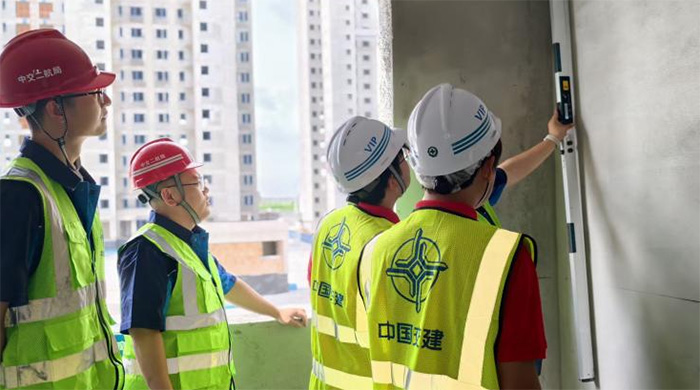 3、小街村改造現場,實操體驗興致濃 來到小街村城中村改造項目現場勘查,在小街村項目現場負責人李柳松的指導下,隊員們開始實操體驗,一對一實操教學生靠尺的使用方法,使用時,將靠尺緊貼被測墻面,通過觀察水平泡是否居中,或讀取檢測儀的數值,來判斷該表面是否符合平整度、垂直度或水平度的施工標準,是保障工程質量的基礎工具之一。在材料實驗室參與小型實操,通過坍落度試驗判斷混凝土工作性、觀察鋼筋銹蝕程度并分析防護措施、使用簡易工具檢測保溫材料厚度是否符合設計要求,讓學生直觀理解材料性能與工程安全、耐久性的關聯。體驗企業引進的智能設備,感受“科技賦能施工”的具體表現,激發對智能建造技術的興趣。
