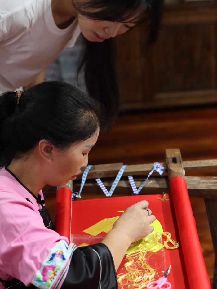 “你看這紋樣,翅膀上的羽毛要分七層配色,從緋紅到靛藍,得用二十四種色線漸變過渡。”年輕繡娘施林嬌指著一幅繡品《百鳥朝鳳》介紹道。她手機里存著三十多組傳統紋樣的數字化檔案,這些源自苗族古歌、遷徙史的圖案,如今通過拍照存檔、電腦配色等方式得以系統保存。