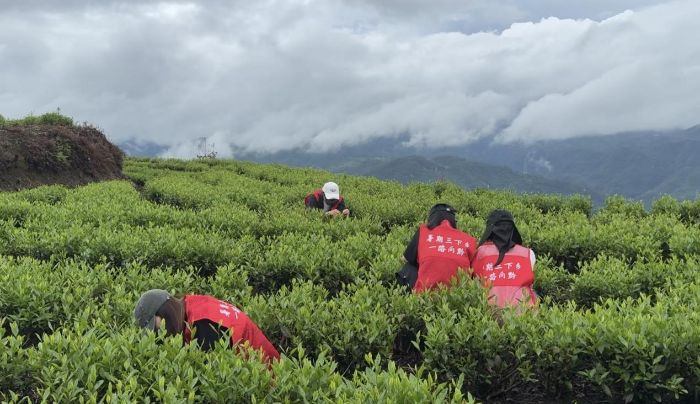 團隊成員在掌握茶苗養護技術后,便與村民們并肩投入田間勞作。身著醒目的紅色志愿背心,他們活躍在一行行青翠的茶壟間,專注地完成各自的農事。有的俯身仔細檢查茶樹的葉片與長勢,不放過任何細微的變化;有的則揮鋤或彎腰,一絲不茍地清除滋生的雜草。汗水浸濕衣襟,泥土沾上褲腳,但無人懈怠。大家懷揣著共同的心愿:希望通過自己實實在在的雙手勞動,為這片土地上的茶田注入活力,以最直接的行動為鄉村振興貢獻一份堅實的力量。