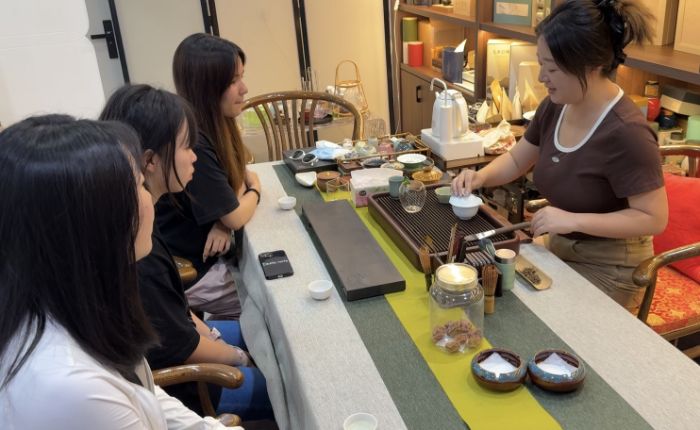 為了更深入地了解茶文化,團隊成員們專門向茶藝老師請教。在一間布置雅致的茶室里,老師為大家展示了專業的茶藝教學。將德旺白茶放入茶壺,從溫杯潔具到投茶注水,每一個動作都輕柔優雅,盡顯茶道之美。成員們圍坐在桌旁,全神貫注地觀察著老師的每一個操作細節,并不時向老師提問。老師耐心地為大家講解德旺白茶的知識、沖泡的技巧以及品茶的方法等知識。通過這次學習,成員們對德旺白茶和茶文化有了更全面、更深入的認識,也為后續在德旺土家族苗族鄉開展茶產業振興實踐活動積累了寶貴的專業知識。大家都表示,要將所學運用到實際中,為推廣當地茶文化貢獻自己的力量。