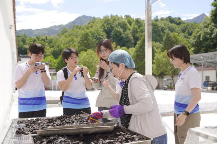 圖為基地員工為實踐團(tuán)成員講解組織進(jìn)行第八次蒸曬的黃精 趙琪浩供圖