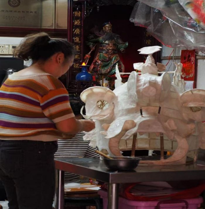 圖1: 醒獅頭制作技藝傳承人郭潤棠師傅的親戚正在為竹篾骨架裱糊桑皮紙。(周子瑞 攝)