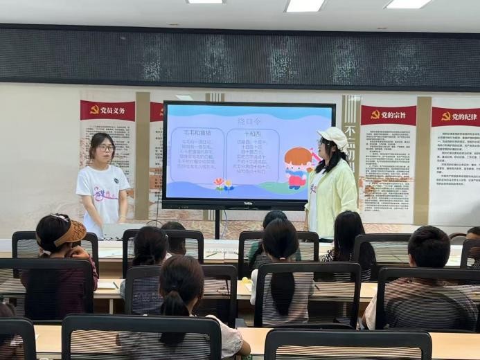圖為實(shí)踐團(tuán)成員指導(dǎo)孩子們正確朗讀繞口令
