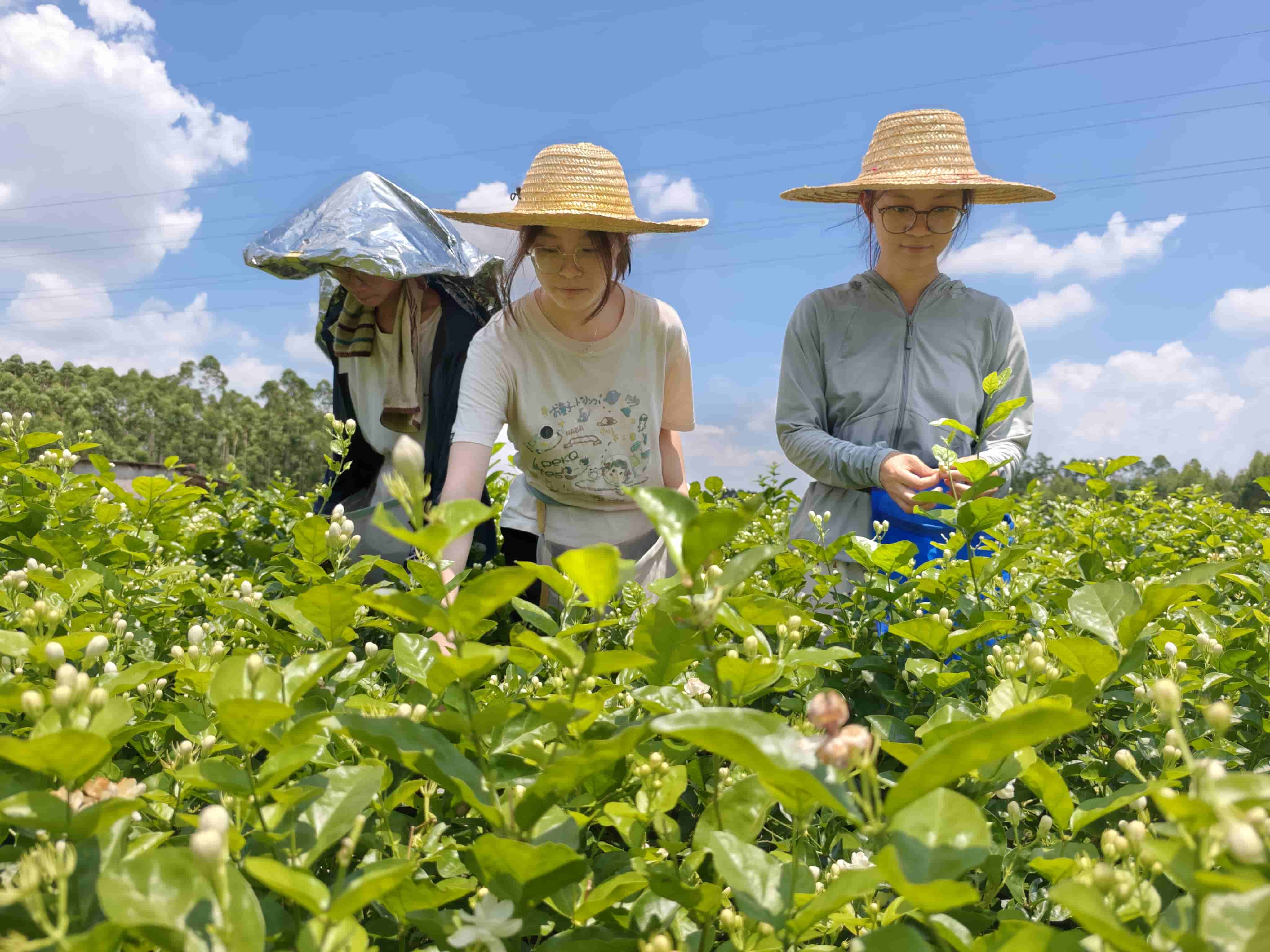 (圖為實踐團(tuán)成員在橫州市茉莉花非遺博物館體驗制茶工序 陳津镅 攝) 翌日下午,實踐團(tuán)來到了石井村,深入茉莉花田,親身體驗采摘茉莉花的樂趣。正值茉莉花盛開的季節(jié),花田里彌漫著濃郁的花香。成員們戴上草帽,化身“花農(nóng)”,穿梭在花叢中,小心翼翼地采摘著含羞待放的花苞。烈日下,汗水浸濕了他們的衣衫,但他們依然干勁十足。