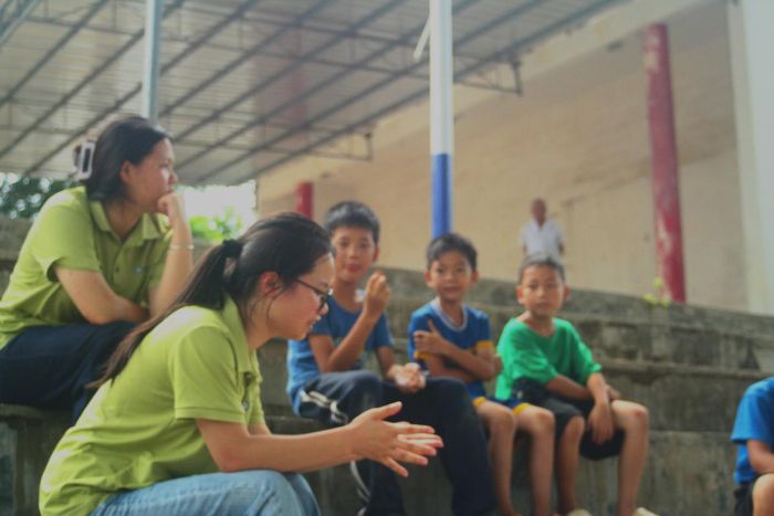 團隊成員與村里的孩子們交流。梁筱敏攝