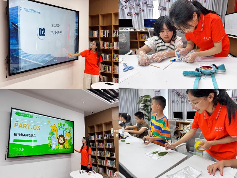 弘揚(yáng)傳統(tǒng)文化,實(shí)踐感受真知。在和順社區(qū)黨群服務(wù)中心,團(tuán)隊(duì)成員高瑞雪、張?zhí)乒?jié),分別為孩子們生動(dòng)介紹扎染藝術(shù)和植物拓印。言傳身教的形式,讓孩子們對(duì)于傳統(tǒng)文化有了初步認(rèn)識(shí);動(dòng)手實(shí)操的過(guò)程,讓非遺匠心的精神深植于孩子們的心間。