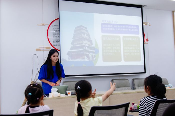 圖為團(tuán)隊(duì)成員講解建筑課程