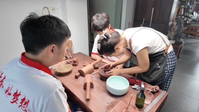 圖2為成員們在老師的指導下制作紫砂壺。周凡琳供圖