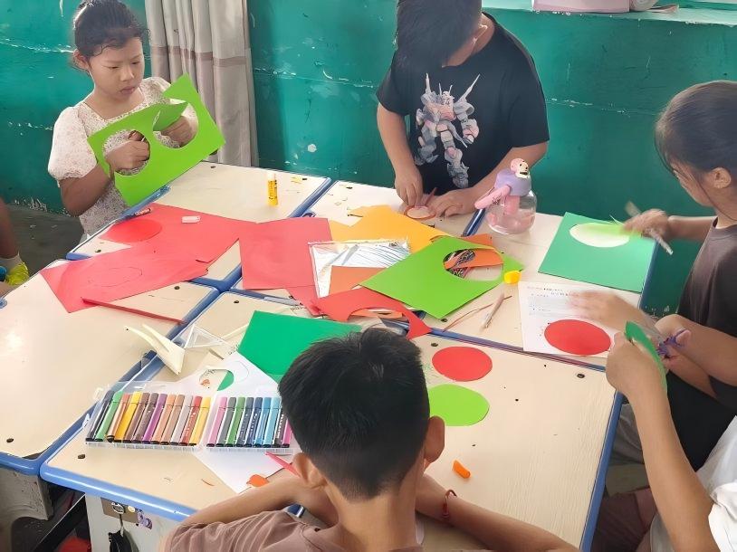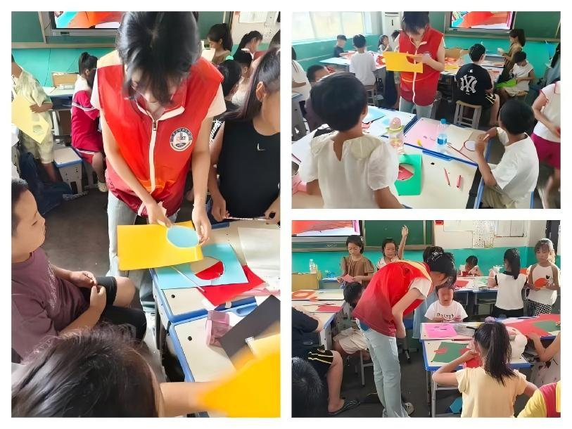 講解結束后,孩子們迫不及待開始制作。有的選紅色彩紙做西瓜形狀扇子,有的拿藍色彩紙制作天空主題扇子。制作過程中,志愿者們穿梭在孩子中間提供幫助。“姐姐,你看我這樣剪對嗎?”一個小男孩舉著剪刀詢問,志愿者立刻俯身,仔細看他操作并指導:“嗯,沿著這條線慢慢剪,小心別剪到手。”還輕輕扶著他的手完成裁剪。