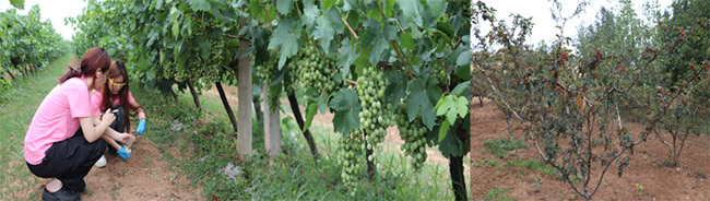 在淳化縣當?shù),大槐樹村的農(nóng)產(chǎn)品以其優(yōu)良的品質(zhì),深受市場的青睞,典型代表農(nóng)產(chǎn)品有“大槐樹秦椒”“大槐樹蟠桃”“大槐樹夏黑葡萄”等。得天獨厚的生長條件造盛產(chǎn)出這些優(yōu)質(zhì)的農(nóng)產(chǎn)品,為了進一步探尋優(yōu)質(zhì)農(nóng)產(chǎn)品背后的土壤奧秘,實踐隊走進千畝花椒基地、桃園基地、夏黑葡萄基地等,各選取5個點,鉆到20厘米深,用專業(yè)工具逐層采集土壤樣本,詳細記錄采樣位置、土壤顏色、質(zhì)地及周邊作物生長情況。