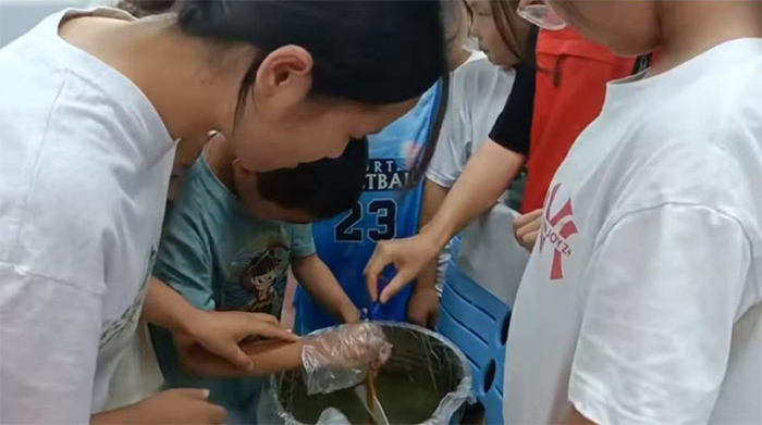 圖為孩子在將扇子入水。樊玲玲 供圖