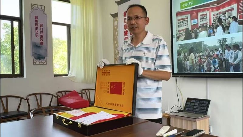 隊員們穿梭于古建與史跡間,觸摸先輩們的精神密碼,感悟文化傳承的溫度。而在這其中,還有一段特別的經歷。書記熱情地為隊員們展示了一面特殊的國旗,這正是2025年1月1日天安門廣場升旗儀式專用國旗。它曾于新年首日飄揚在天安門廣場,后跨越千里扎根革命老區小窯村,成為激活紅色基因、賦能鄉村振興的文化紐帶。看著這面國旗,隊員們更深刻地感受到了小窯村紅色文化的厚重與傳承的意義。