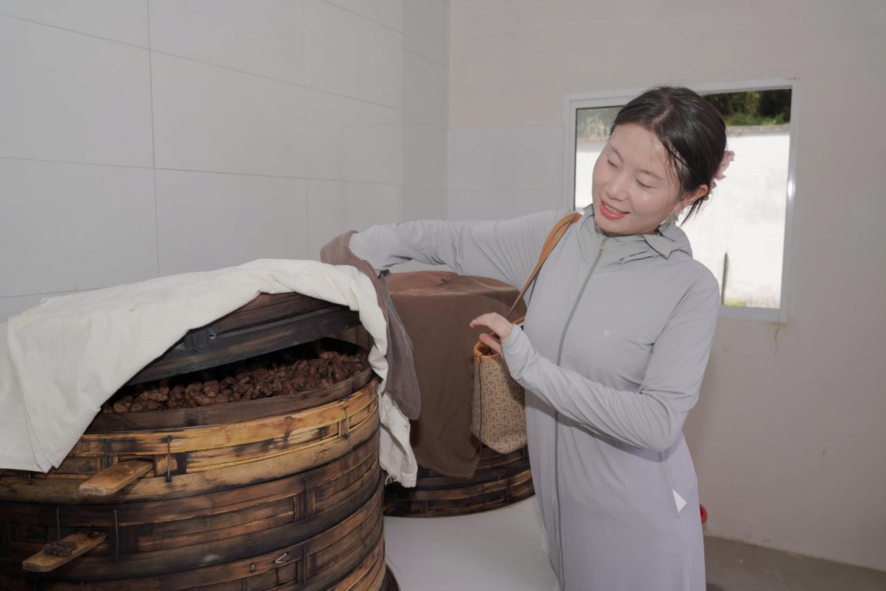 圖為實踐活動的基地負責人為實踐團展示正在進行加工的黃精 張振宇 供圖