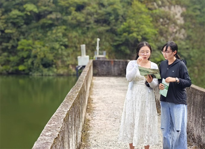 圖8:“皖”頃碧綠實(shí)踐團(tuán)隊(duì)成員在高竭水庫邊聽村書記助理講解黃綺越供圖