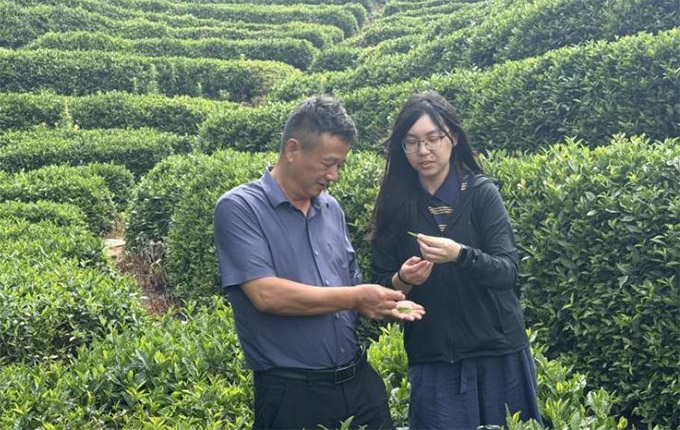圖4:茶園負(fù)責(zé)人向“皖”頃碧綠實(shí)踐團(tuán)隊(duì)隊(duì)長介紹特色云霧茶陳芮敏供圖