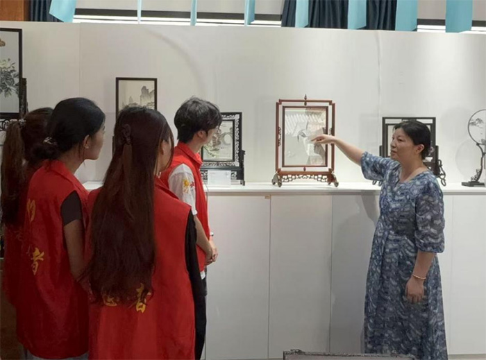 7月5日,無錫學院“真吳繡”社會實踐小分隊走進國家級非物質文化遺產無錫精微繡傳承人鮑文姬的“繡澤江南”工作室,開展無錫精微繡非遺實踐活動。隊員們通過觀摩珍品繡作、聆聽創作故事、體驗刺繡針法,深入感受這門國家級非遺技藝在當代傳承中所蘊含的匠心與創新,為助力非物質文化遺產保護傳承貢獻青春力量。