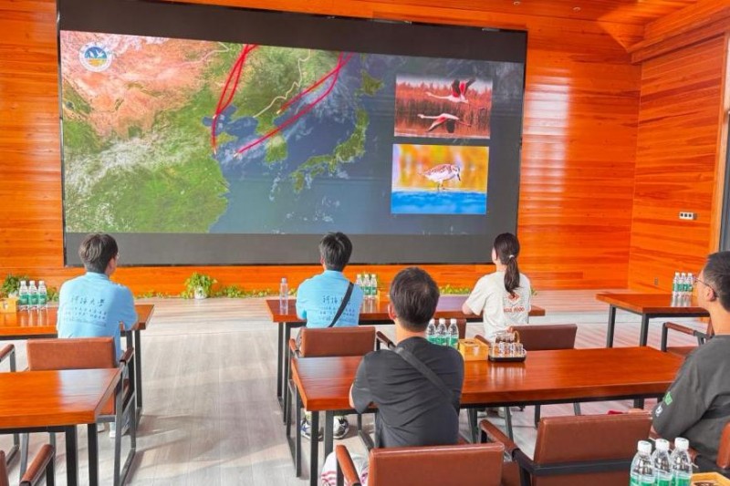 在丹頂鶴博物館報告廳,實踐團隊觀看紀錄片《一個真實的地方》,并圍繞鶴類追蹤技術、濕地調控方式及村民參與管理等方面開展記錄。