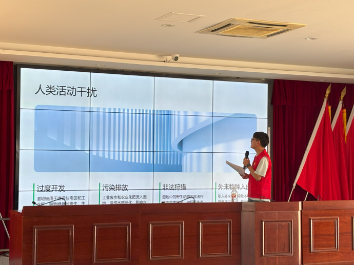 宣講前,團隊成員分發調查問卷,調研居民濕地認知情況;宣講中,宣講人以“濕地是什么”為切入點,重點圍繞“濕地三大功能”“人類活動影響”“本地典型濕地”等內容展開講解,向居民清晰介紹濕地類型、生態價值與保護困境,并結合圖示和案例提高參與性。