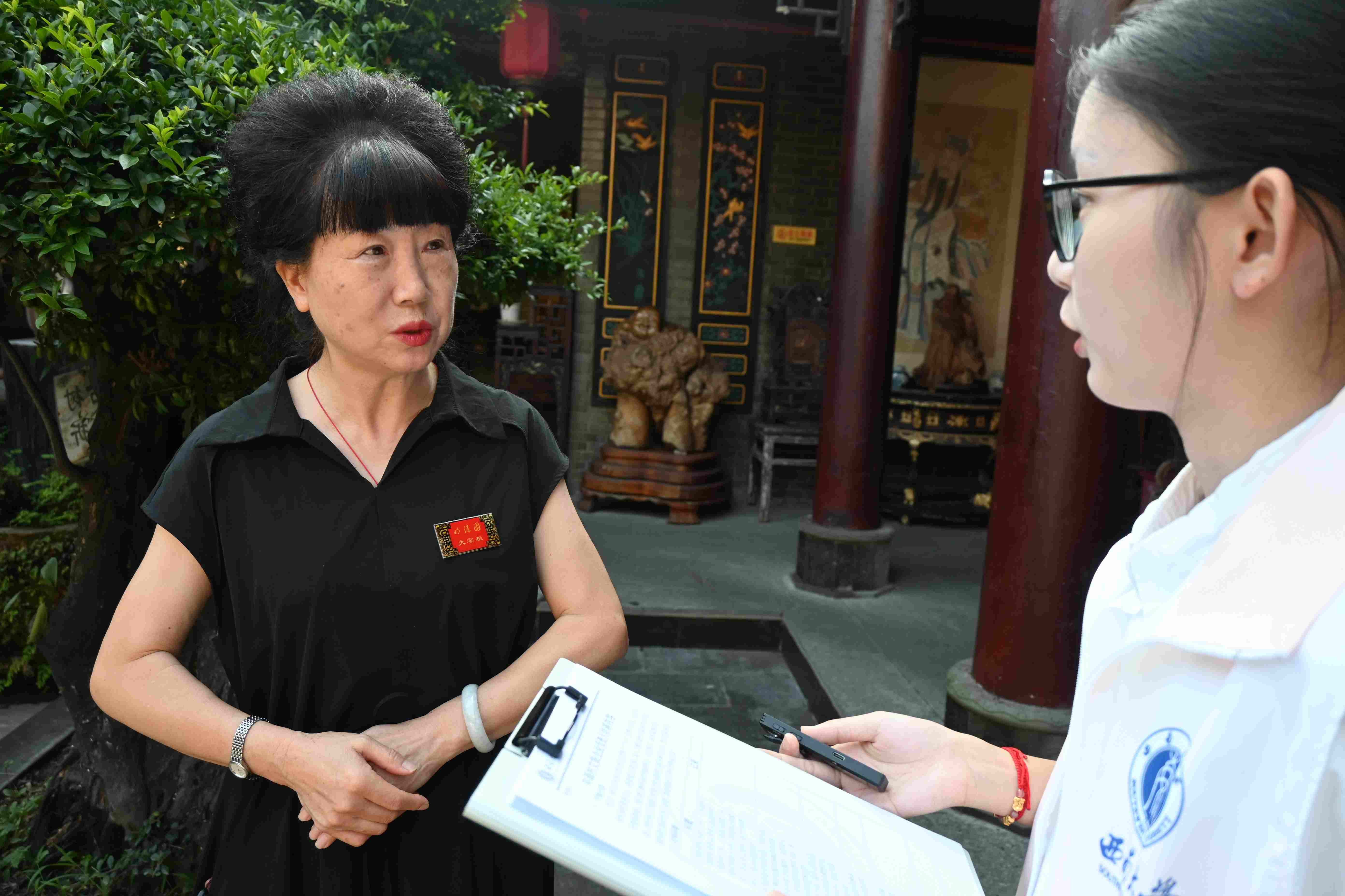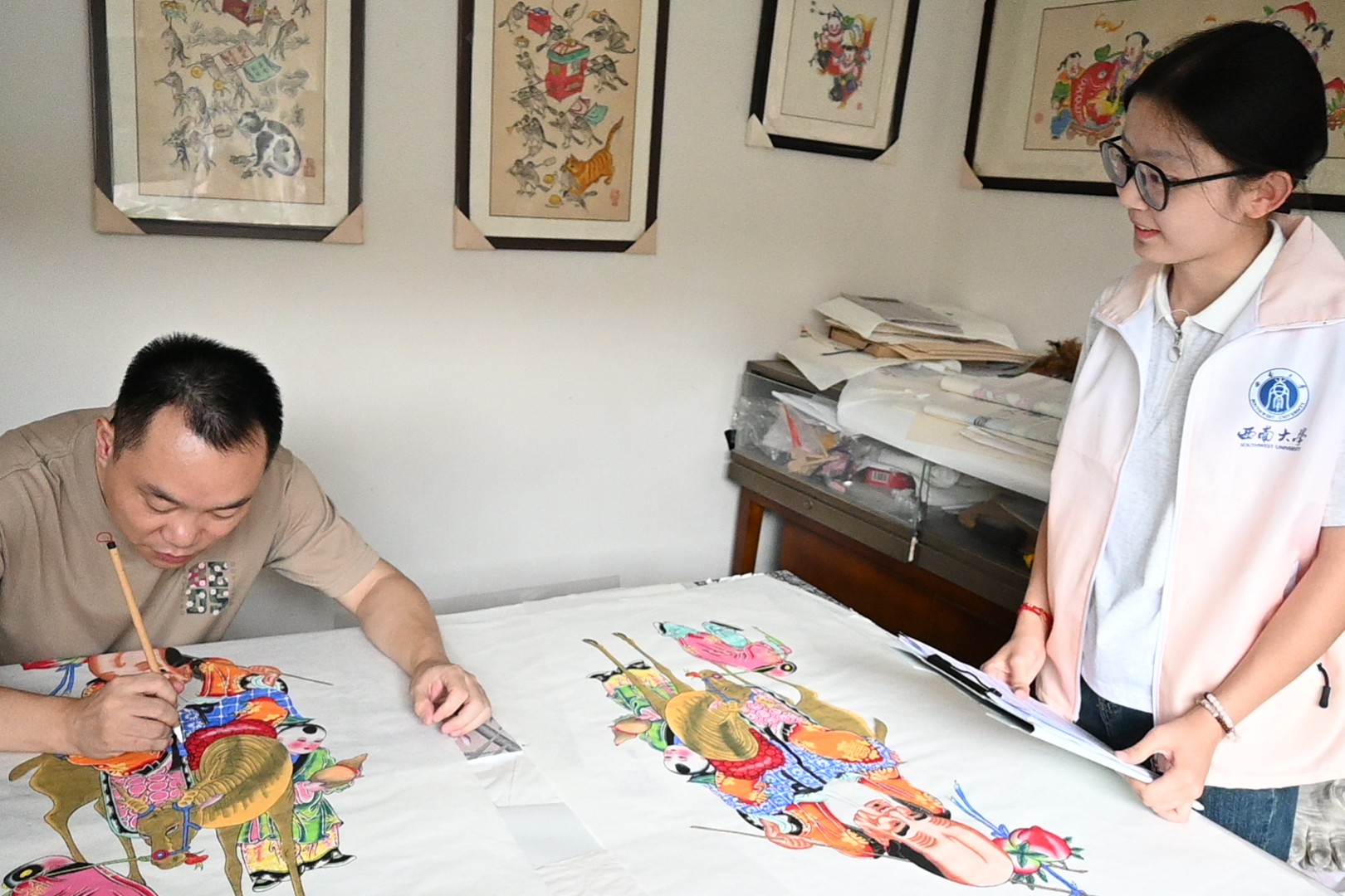 7月26日上午,小分隊走訪了年畫藝人陳剛先生的工作室。進門時,陳先生正專注于年畫創作——綿竹年畫的創作經“起稿、刻板、印墨、上色”等一系列嚴謹工序,線條需有“穩、準、狠”的遒勁力道,色塊更求“爆、亮、透”的飽滿效果。在古樸雅致的工作間中,隊員們近距離觀看了年畫精湛的創作過程,進一步明晰了綿竹年畫的起源、發展及藝術特色等,并從年畫藝人的視角了解了年畫傳承現狀以及未來發展期望。在訪談中陳先生坦言,作為中國四大年畫之一的綿竹年畫,受限于宣傳不足、大眾普及度低及實用性欠缺等問題,其傳承確實存在困難與挑戰。“不僅是綿竹年畫,絕大部分的非遺手藝都面臨著一定的生存問題,”陳先生感慨道,“但是隨著新時代的發展,‘非遺進校園’等活動和自媒體的興起,越來越多的年輕人了解、欣賞并熱愛這一非遺手藝,愿意參與學習和發展創新。”