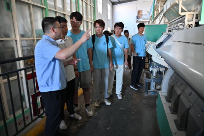在張智偉的引導下,實踐隊隊員們走進了大米加工的核心區域——現代化生產車間。機器的轟鳴聲匯成一首工業交響曲,空氣中彌漫著稻米清新的氣息。張智偉如數家珍般帶領大家沿著生產線一路參觀,詳細講解了從原糧到精米的蛻變之旅。
