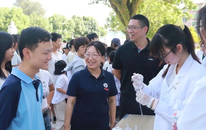 閩南師范大學黨委副書記林致遠、黨委副書記廖志丹等領導一行親切慰問了閩南師范大學化學化工與環境學院實踐隊,并實地觀摩科學嘉年華活動。廖志丹副書記逐一走訪各實驗展位,與參與實驗的學生親切交流。此外,她還對實踐隊員將專業知識轉化為趣味科普的努力給予了高度肯定,鼓勵大家繼續發揮所長,在孩子們心中播撒科學種子,為鄉村教育振興注入青春力量。