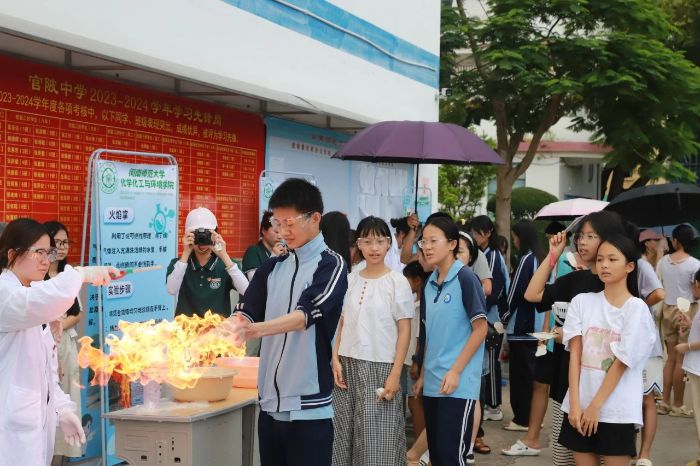 2025年是國家深入實施創新驅動發展戰略、加快建設科技強國的關鍵節點,也是《全民科學素質行動規劃綱要》縱深推進的重要一年。提升全民科學素養,激發鄉村青少年的科學興趣與創新潛能,是打通科技賦能鄉村振興“最后一公里”、筑牢人才根基的核心任務。為響應國家鄉村振興戰略號召,7月6日,閩南師范大學化學化工與環境學院實踐團隊積極發揮學科優勢,在閩南師范大學附屬官陂中學策劃了一場主題為“科普實踐進官陂,青春飛揚嘉年華”的科學嘉年華活動。