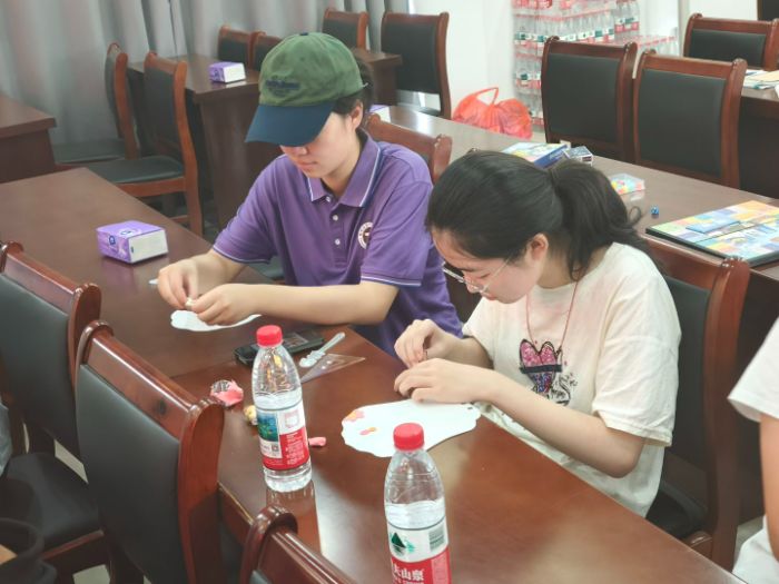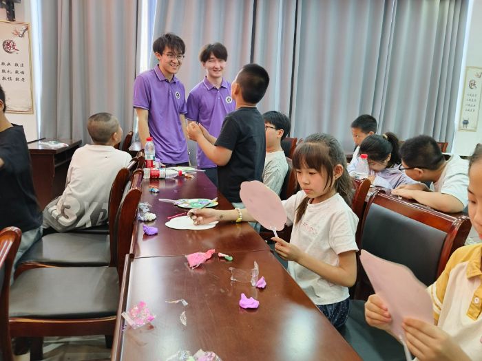 (圖為7月7日,“情系鹽城鄉(xiāng)村 愛撒支教課堂”團隊成員與孩子們圍繞粘土團扇制作交流。周蕓珂供圖)