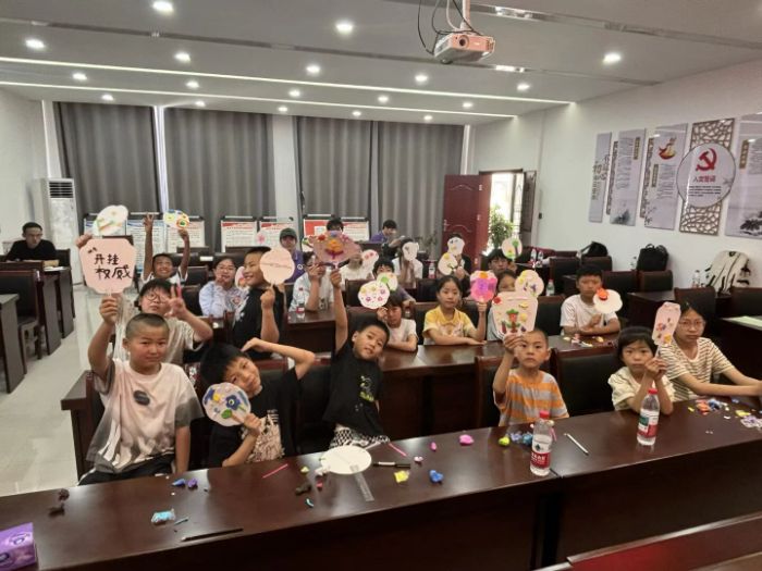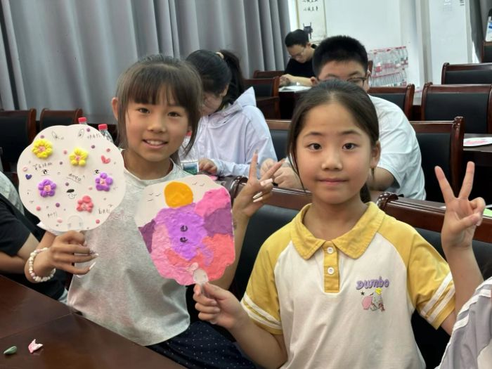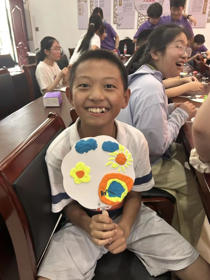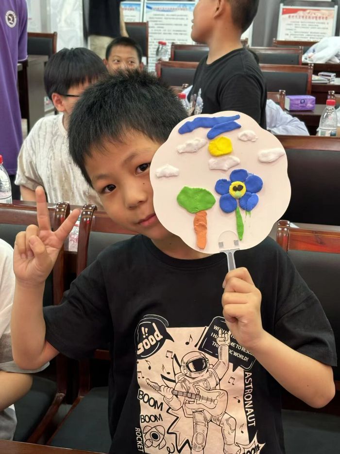 (圖為7月7日,孩子們手持粘土裝飾的創(chuàng)意團扇,開心比耶展示成果。楊珺涵供圖)