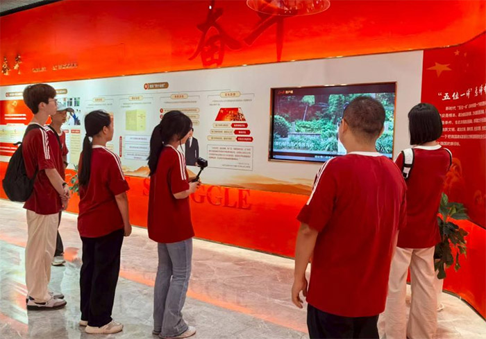 侯老師介紹:“抗大1936年創辦,十年培養大批軍政干部,辦學條件艱苦卻信念堅定。”成員們凝視展柜中的槍支彈藥、觀看視頻資料,仿佛回到烽火歲月。石板凳課堂讓大家聯想到如今的現代化設施,深刻體會先輩求學的不易。