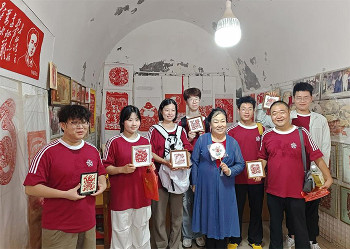 途中,實踐團在楊家嶺附近的非遺展示區偶遇陜北剪紙大師李福愛。她正用剪刀將紅紙剪成“延安精神”主題圖案,“你看這‘自力更生’四個字,每一筆都要有勁兒,像當年共產黨人干活那樣。”李福愛邊剪邊說。成員們與她合影,鮮紅的剪紙成為黨史傳承的生動注腳。
