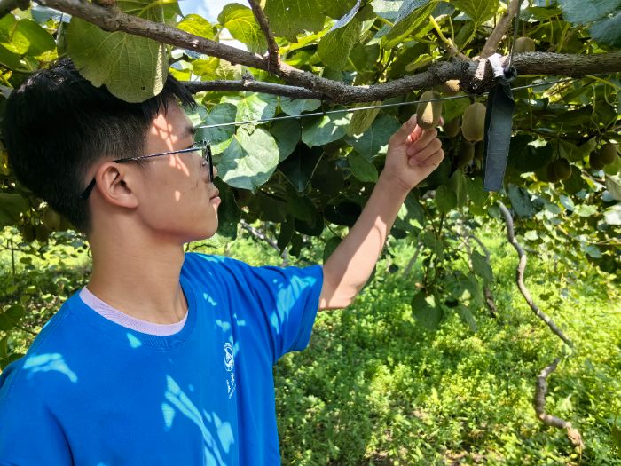 (圖為實踐隊員跟隨周學良進入果園調研。通訊員李夢瑤攝) 隨后,實踐隊隊員深入果園內部開展調研與討論。在縱橫交錯的獼猴桃藤下,隊員們觀察并記錄了當前階段獼猴桃的生長狀況。通過對比所記錄的各項指標,隊員們不僅直觀地了解到不同果品的精細化管理差異,更深刻體會到基地工作人員應對市場、順應自然的智慧與辛勞。大家表示,這不僅是“看果”,更是向扎根土地、向上生長的勞動者學習,切身感受鄉(xiāng)村振興的厚重責任。